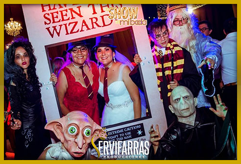 Para los novios que quieren algo fuera de lo común y que son fanáticos Hogwarts. Diviértete con Harry Potter; Voldemort, Dobby, Bellatrix, y el Profesor Dumbledore en una fascinante puesta en escena y un divertido espectáculo lleno de magia temático para tu Fiesta.